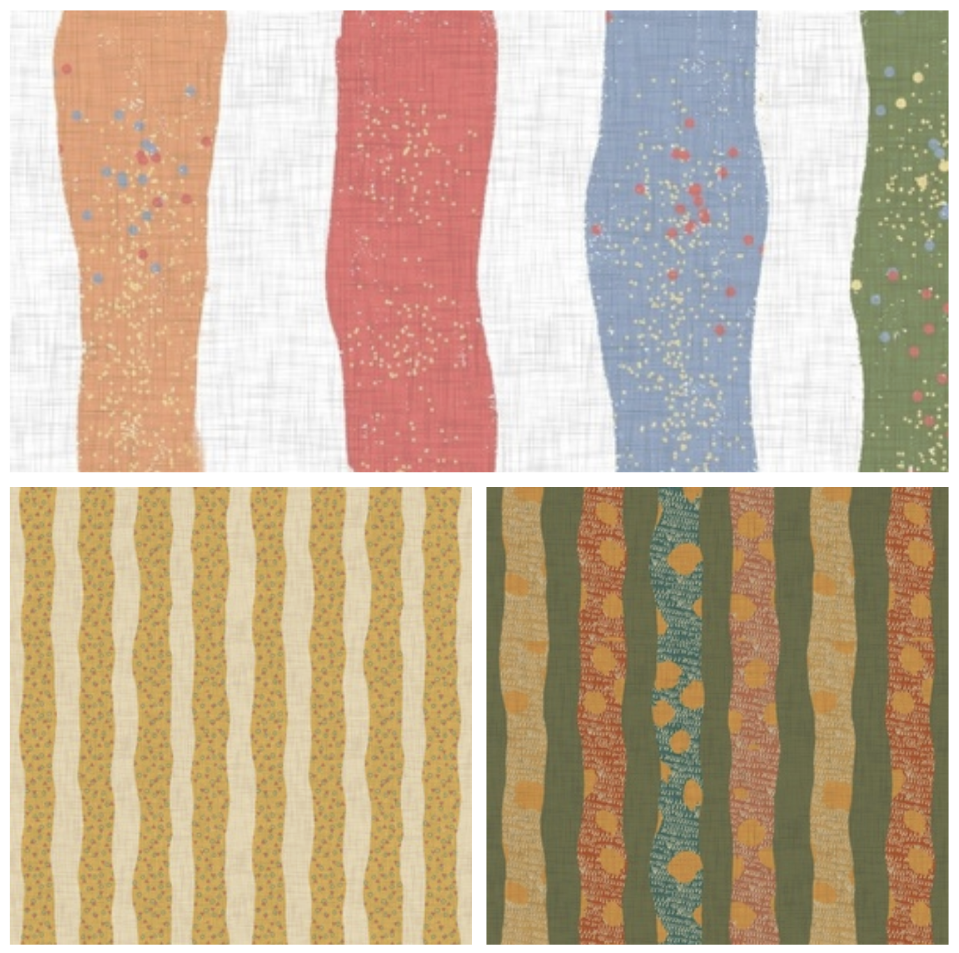 Full of movement and color, Fun Stripes brings an artistic twist to a classic motif. Wavy lines, painterly dots, and textured layers play across palettes of sunshine gold, soft earth tones, and cheerful brights — perfect for adding rhythm and warmth to any project, from modern quilts to statement home décor.