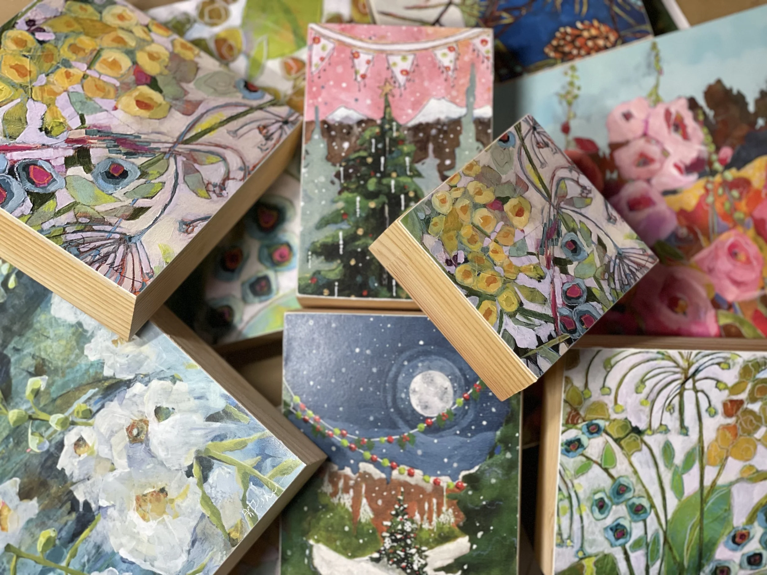 This wood block print is made from my original acrylic painting of Pink Skies and Party Flags; two of my favorites things. This sweet 4×6 holiday print is small but mighty and filled with lots of detail. Three snowy mountains, a gold metallic star atop an highly adorned holiday tree and dozens of hand painted snowflakes!