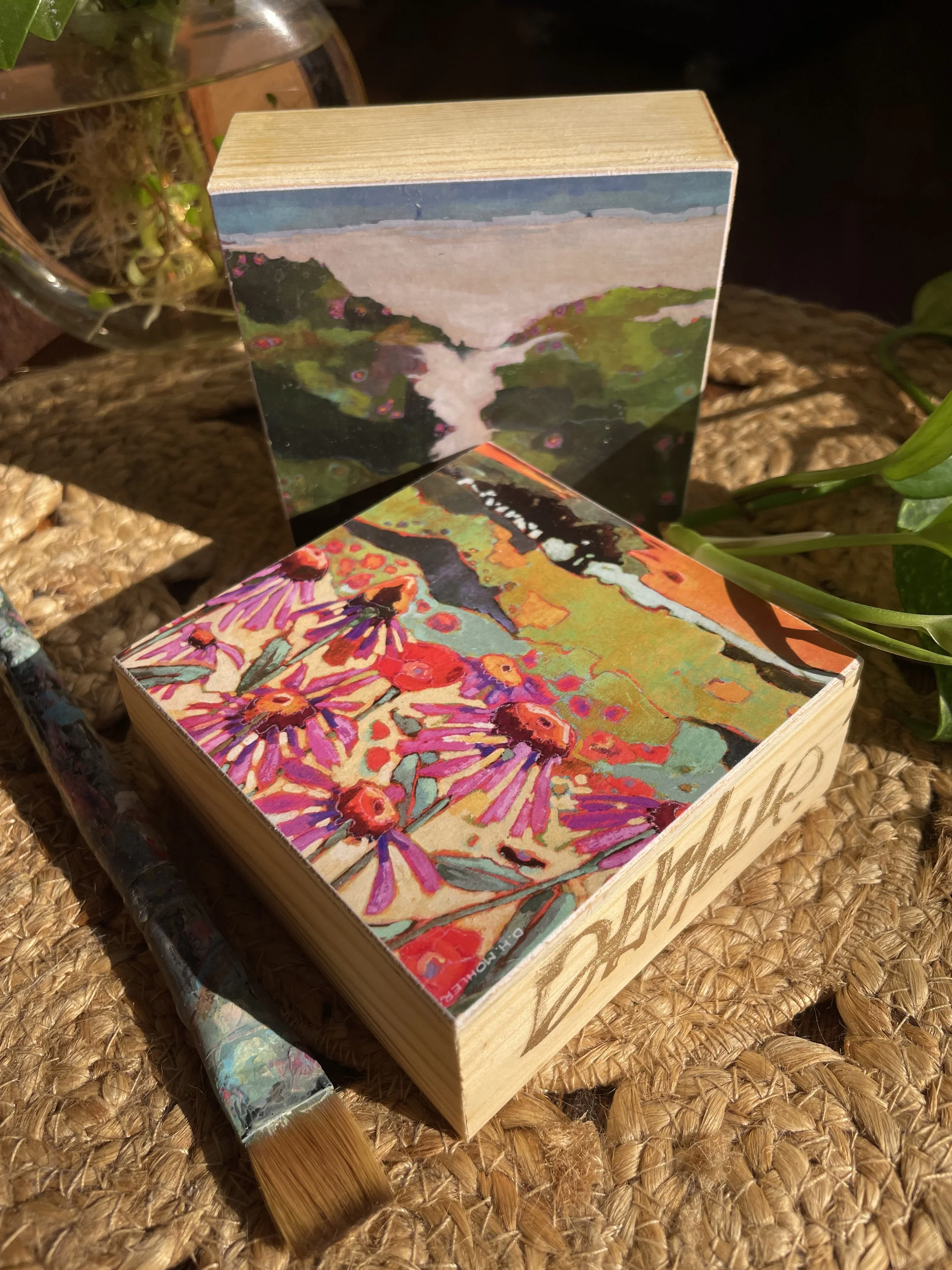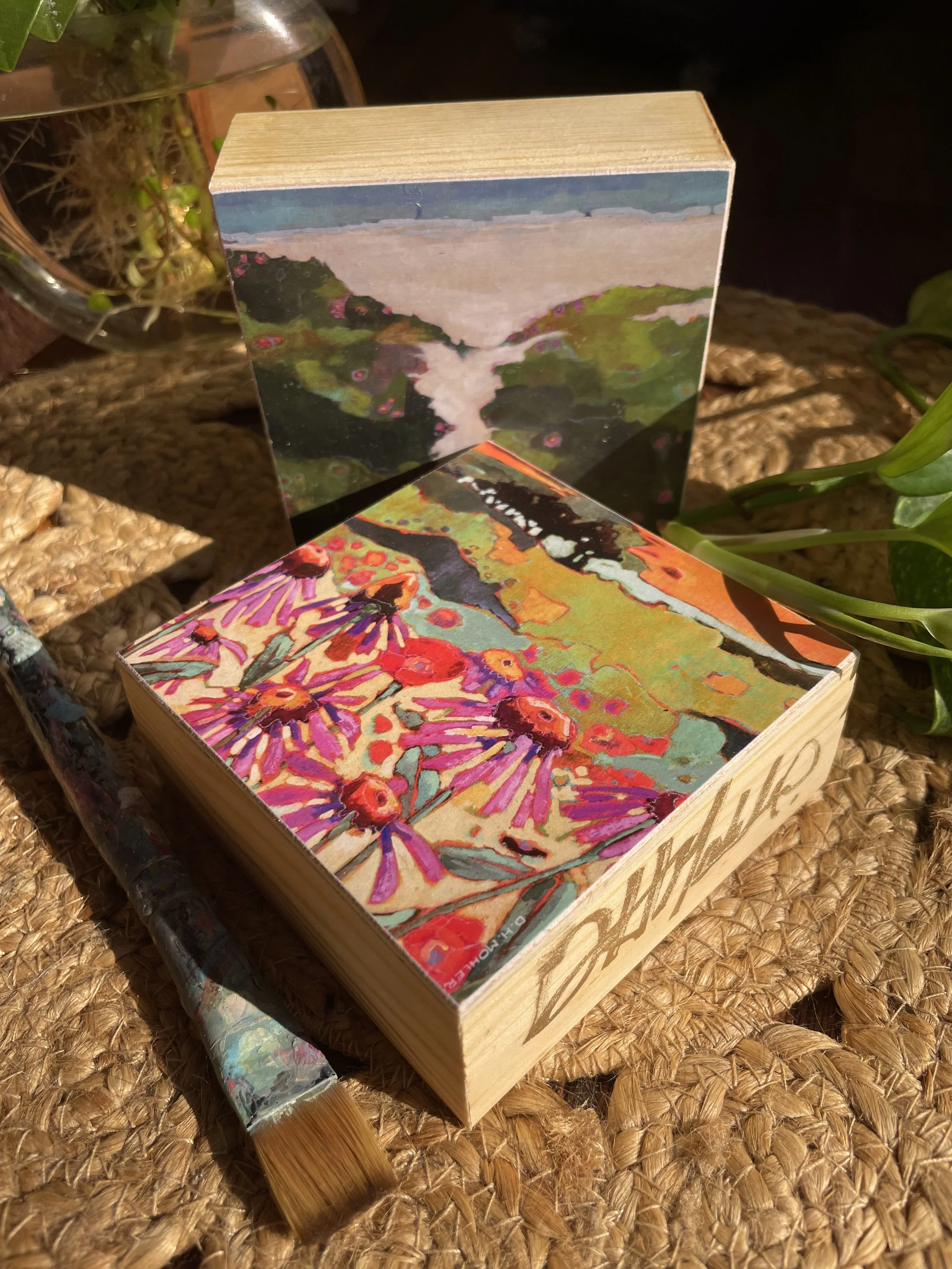 This lupine wildflower artwork is mounted on a solid wood block, creating ready-to-hang botanical wall decor. It also can be styled on a shelf or stack on books, making it ideal for small spaces and layered decor.